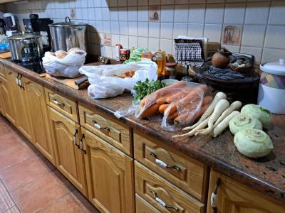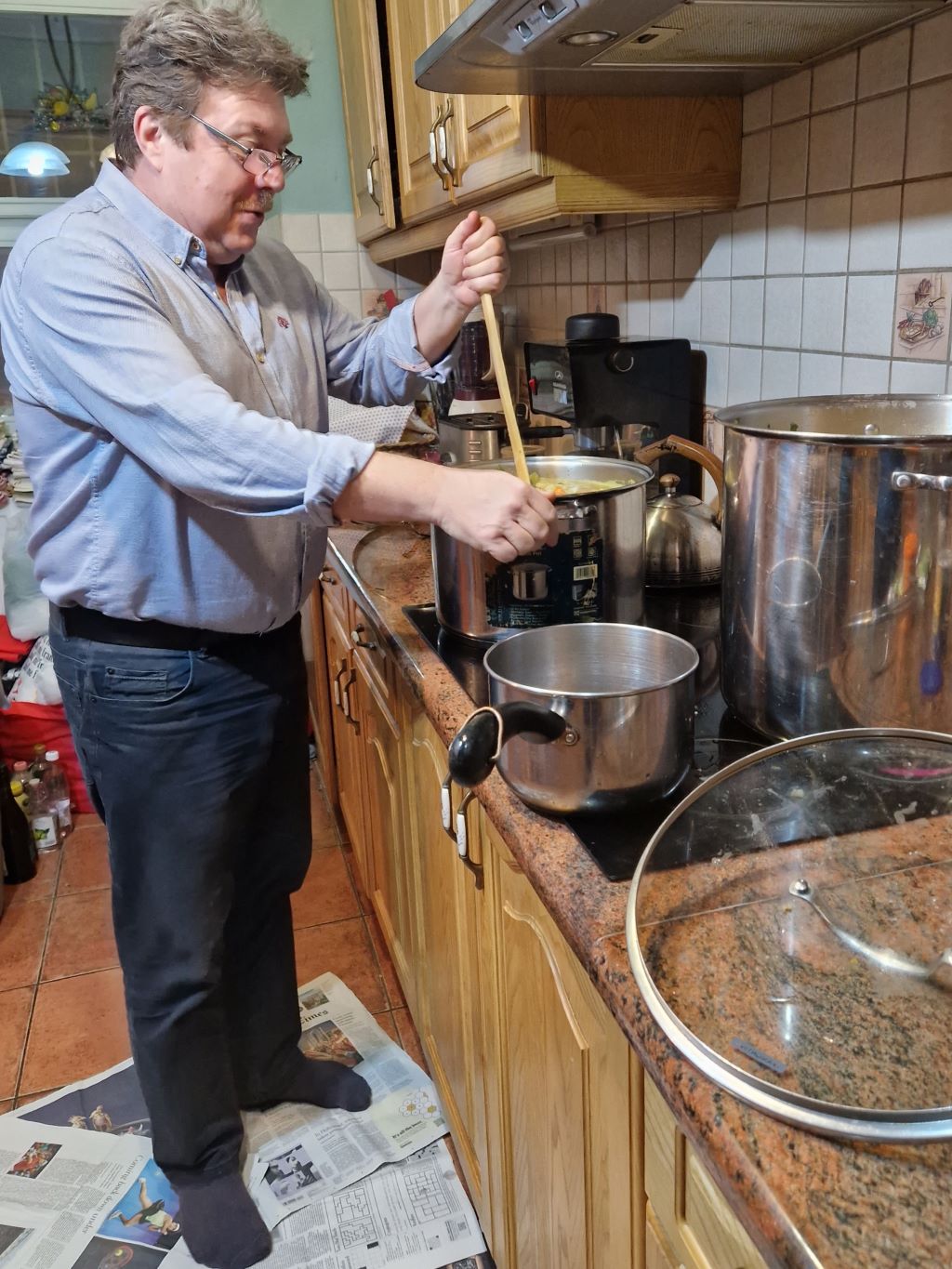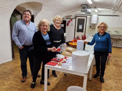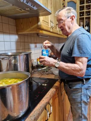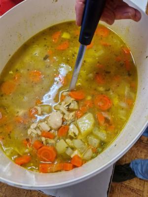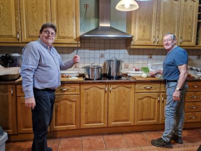 Ahogy ígérték is, fazekat és fakanalat fogtak a Pécsi Első Lions Club budapesti tagjai, Keys Mária, férje, Joe és Bana Gábor. Barátaik, Németh Anna és Kecskés Magdi segítségével újra jóízű és tartalmas vacsorát készítettek. 52 adag csirkeragu leves készült, almával és naranccsal.